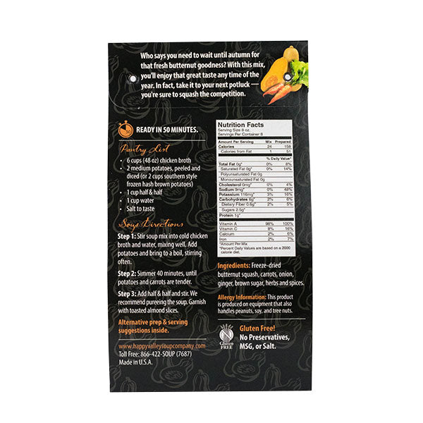 Contains: Freeze-dried butternut squash, carrots, onion, ginger, brown sugar, herbs and spices