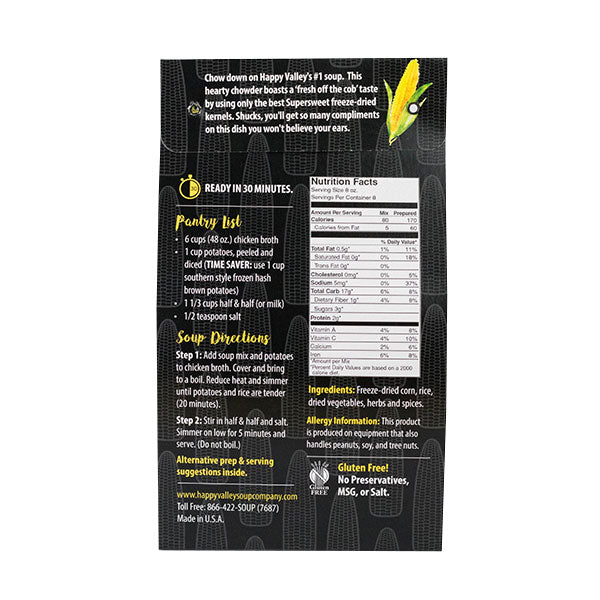 Our #1 best-selling soup for over 10 years! Featured on the TODAY Show with Giada De Laurentis and Al Roker! This chowder boasts a ‘fresh off the cob’ taste by using only the best SuperSweet freeze dried corn. This 30 minute quick cook chowder is enhanced by the perfect seasoning blend. Simply add broth, potatoes and cream for a superb taste. Chicken or seafood can also be added to this hearty chowder.