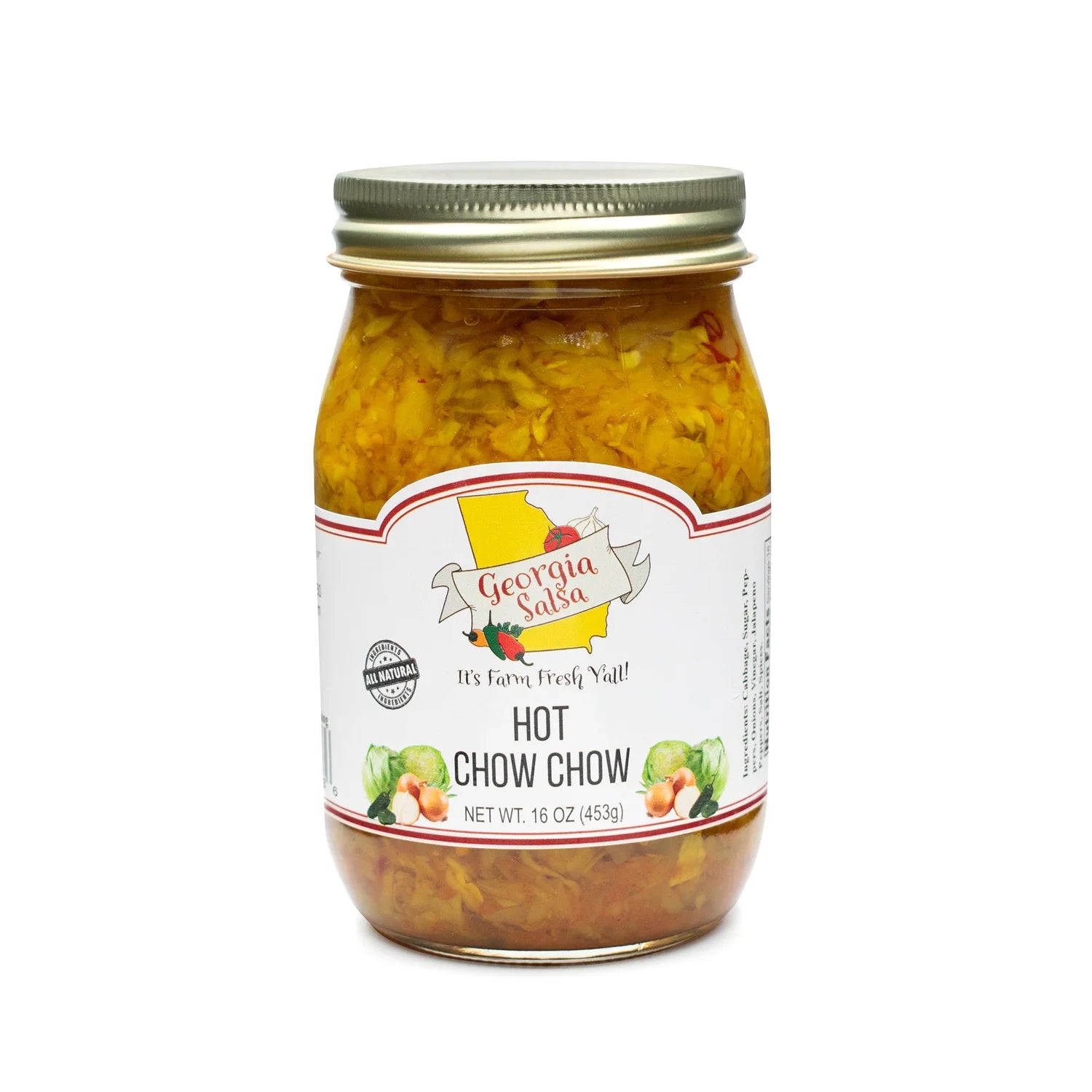 Spice up your meals with our Hot Chow Chow! This fiery relish features a blend of fresh cabbage, sweet sugar, crisp peppers, and tangy onions, all enhanced with a splash of vinegar and the heat of jalapeno and cayenne peppers. Seasoned with just the right amount of salt and spices, this chow chow is perfect for those who love a bold and spicy kick. Add a spoonful to your favorite dishes for an extra burst of flavor or enjoy it as a zesty condiment on its own. Ideal for spice enthusiasts looking to elevate their culinary experience.