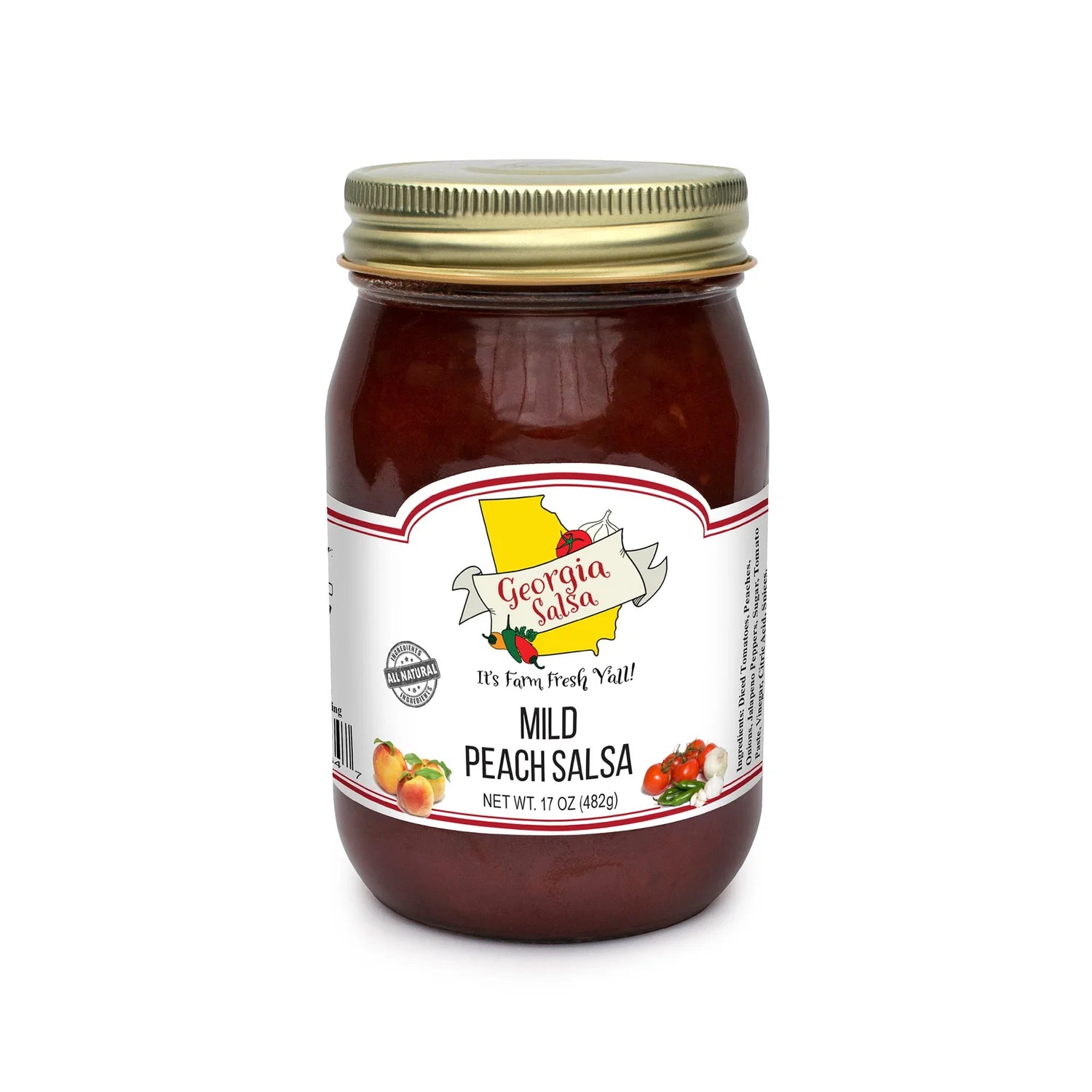 Ingredients: Diced Tomatoes, Peaches, Onions, Jalapeño Peppers, Sugar, Tomatoed Paste, Vinegar, Citric Acid, Spices.