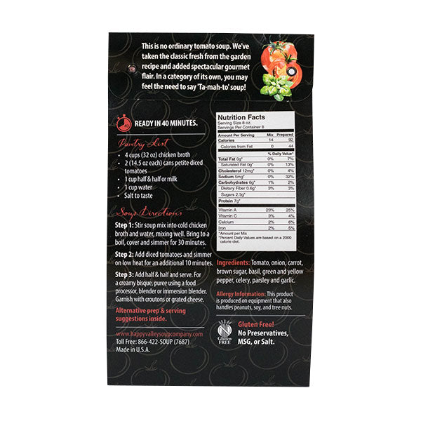 This is no ordinary tomato soup. We’ve taken the classic fresh from the garden recipe and added spectacular gourmet flair. In a category of its own, you may feel the need to say ‘Ta-mah-to’ soup!